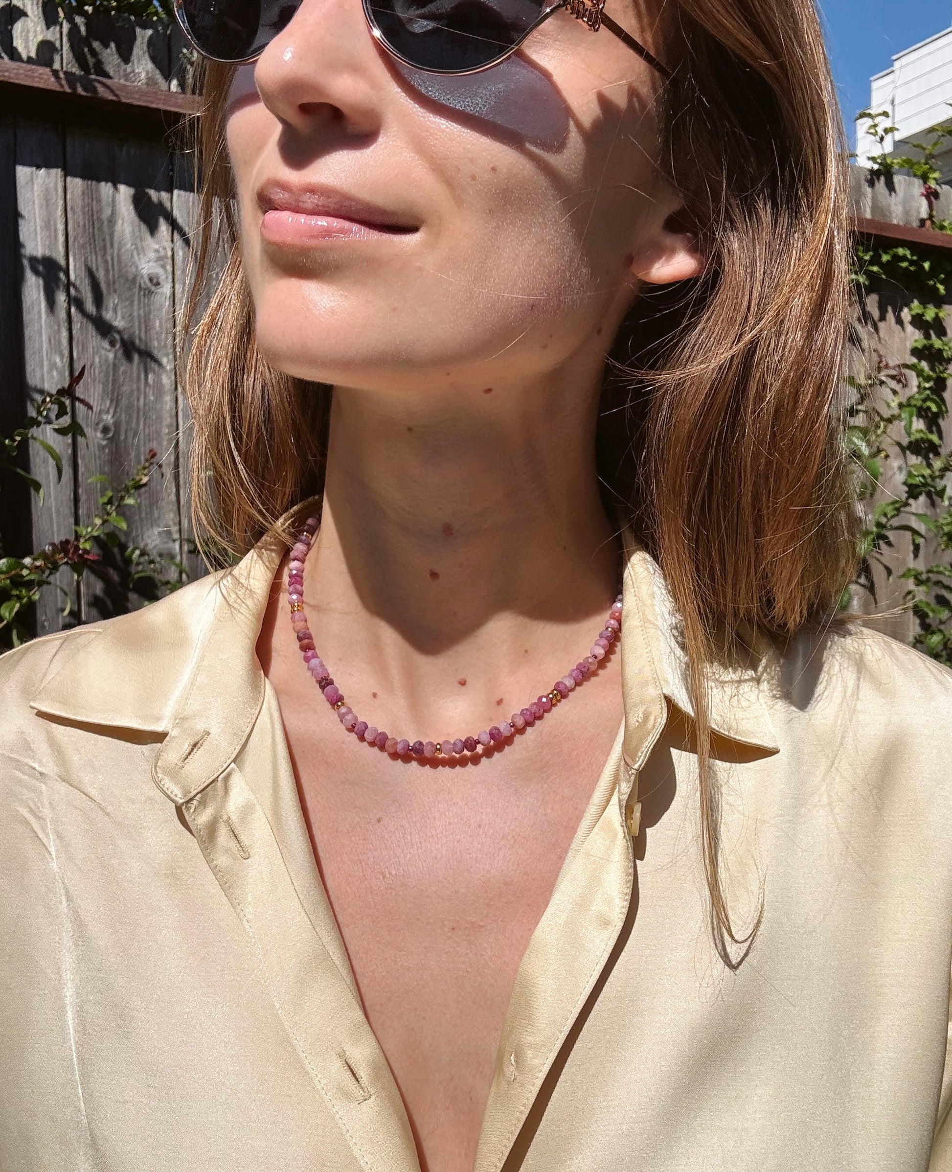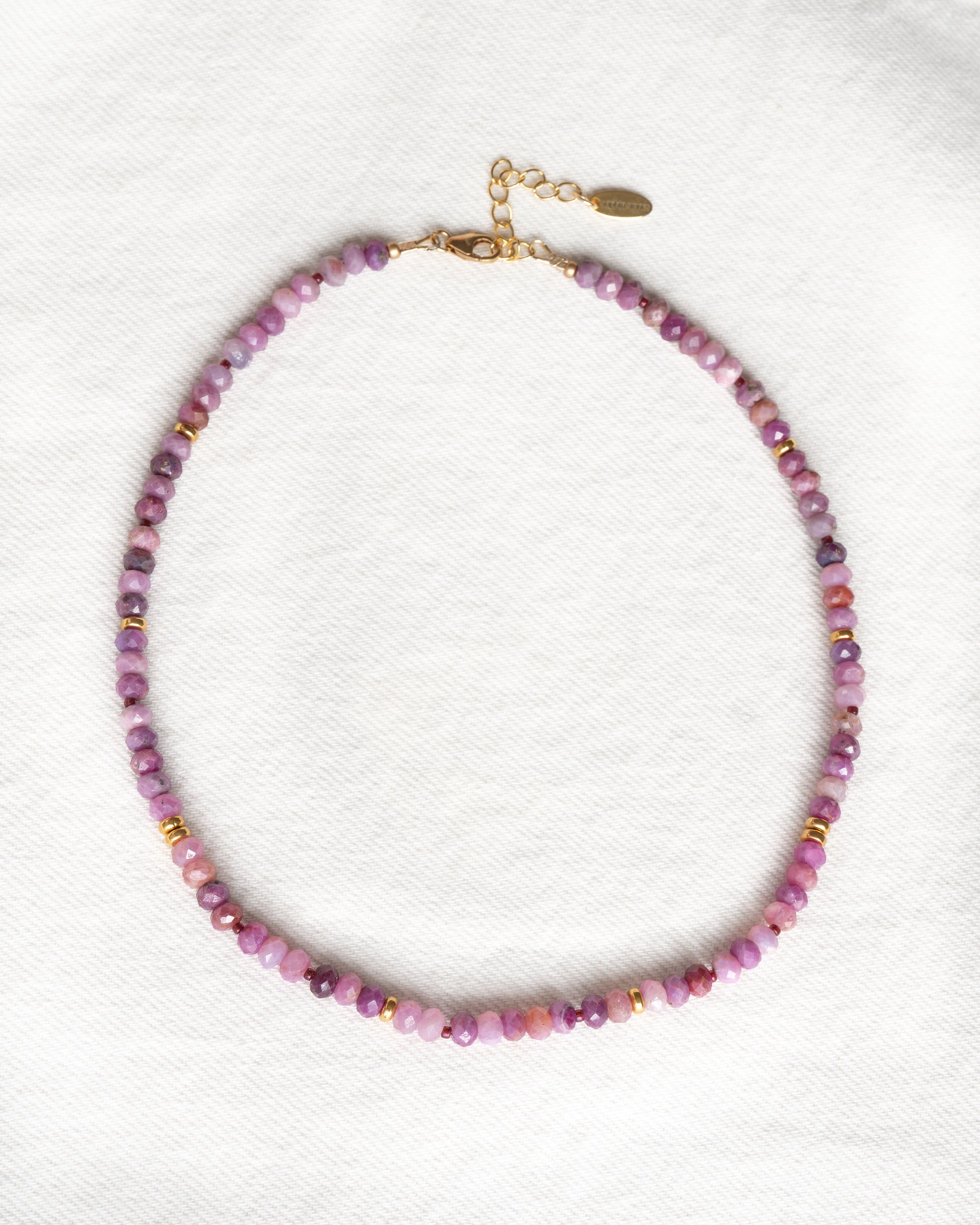 Ruby stones in pink and violet tones. Each stone contains unique variations that shine beautifully in sunlight. Gold filled accents are placed throughout for additional shine.