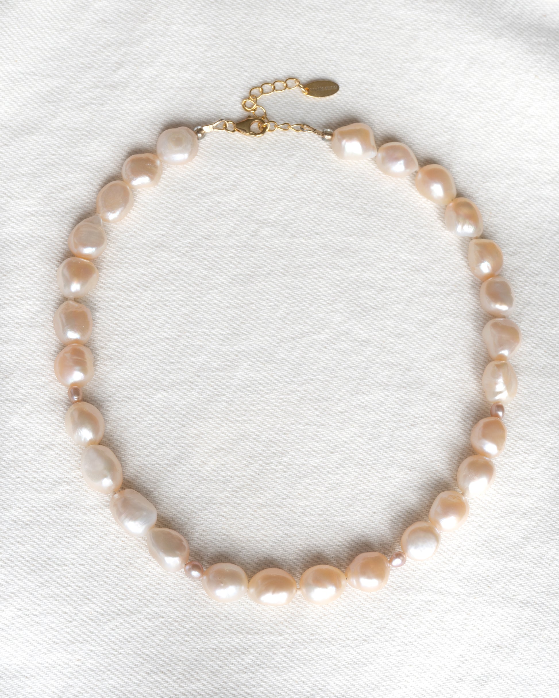 Natural pink freshwater pearls in a statement style necklace. Each pearl is unique in size and shape.