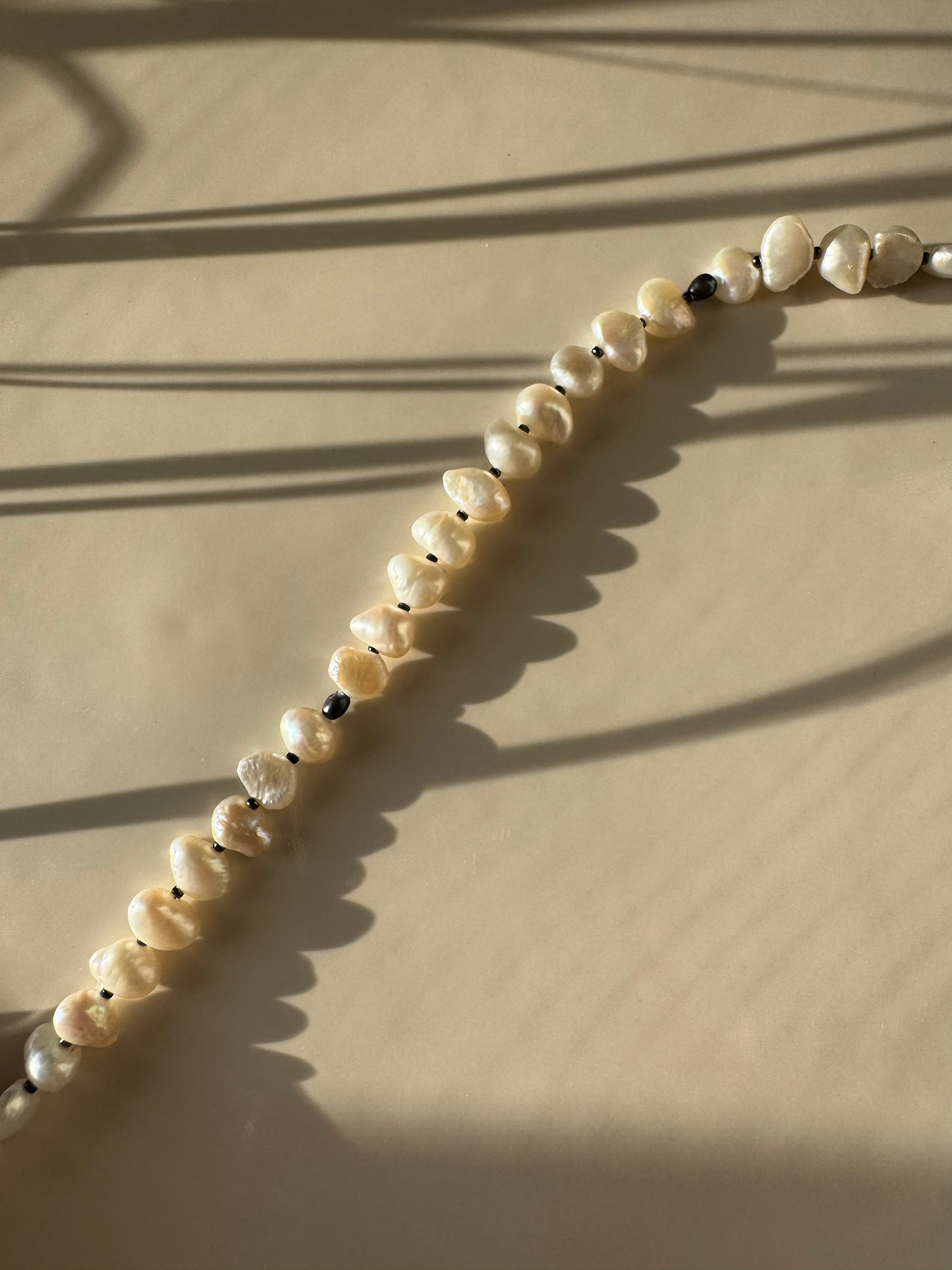 White freshwater pearls with black pearl accents throughout. Each stone is unique in size and shape.
